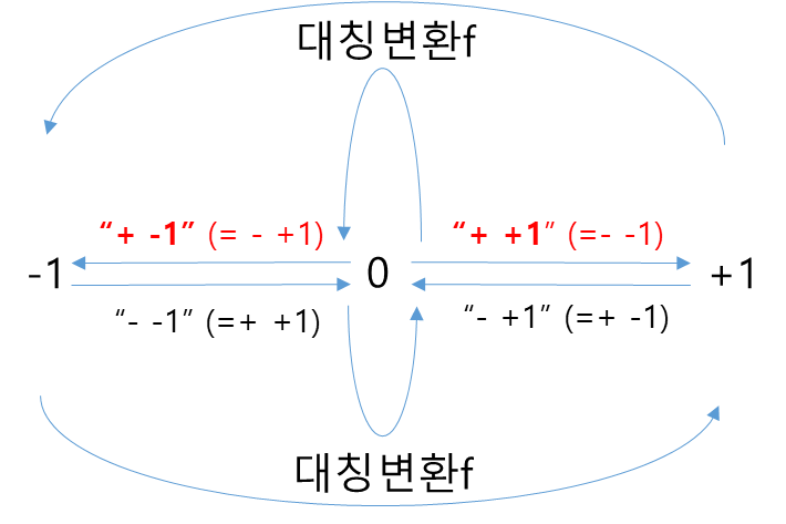 - 위 대칭 전환 체계를 정의해나가보면, 음과 양의 두가지 변환이 합쳐지면 무(0)로 귀결된다고 보일 수 있다. 즉 아래를 만족한다는 것으로 정리된다. "+ (+1)"이라는 덧셈은 0에서 +1로의 변환, "+ (-1)"이라는 덧셈은 0에서 -1로의 변환이다.