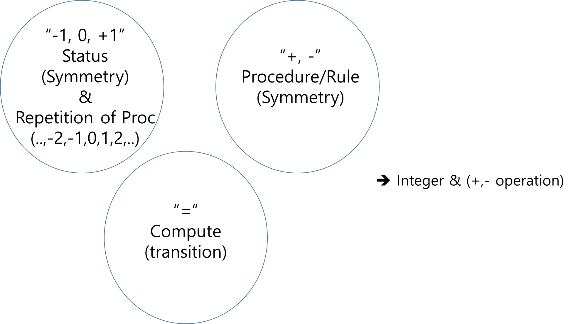 다시 정리해보면 (-1), (+1), (0) 이라는 3개의 정보 상태(대칭구성의 3가지 정보)와 덧셈과 그 반대변환인 뺄셈이라는 연산 규칙을 최초에 상정한다.